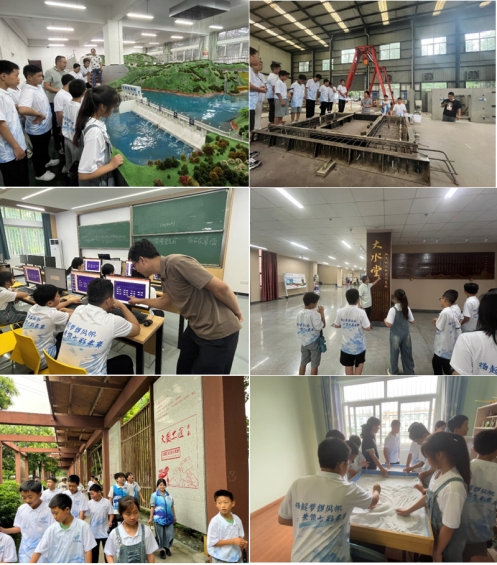 走进四川水利职业技术学院,在水利工程学院参观了“数字流域与水利枢纽动态仿真实训平台”,老师介绍了溪洛渡水利枢纽、武都水利枢纽、紫坪铺水利枢纽和洋潭滚水坝等水利工程模型,现场观看了动态仿真水利工程的运行演示;在建筑工程学院实训场,参观体验了装配式建筑和智慧建造原理;在学校新媒体教室,马克思主义学院老师围绕“推普助力乡村振兴”为孩子们介绍普通话的演变历史,现场教授规范发音要领和日常练习方法;在学校图书馆,谢祥林教授通过讲解《离堆谒伏虎观》,让孩子们去感受都江堰水利工程厚重的历史底蕴;在学生工作处心理健康中心,心理健康教师引导孩子们体验心理治疗技术的“沙盘游戏疗法”,助其探索自我,找到情绪宣泄和压力释放的途径。